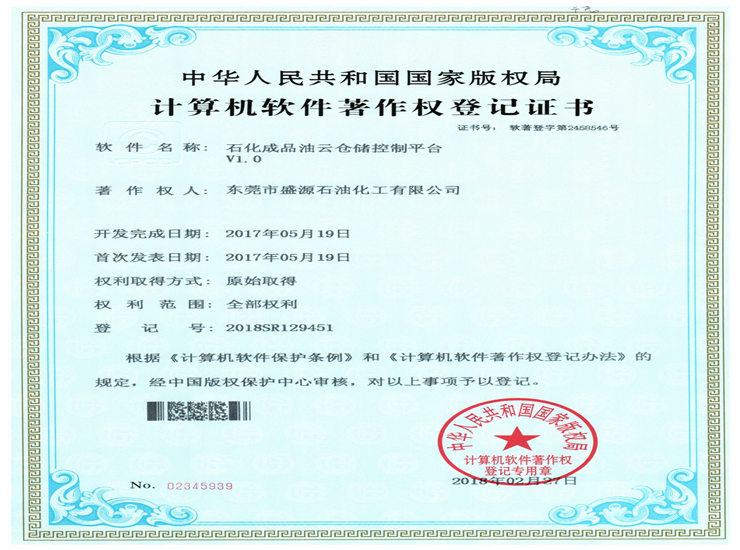 石化成品油倉儲云控制平臺著作權登記證書Click for larger image